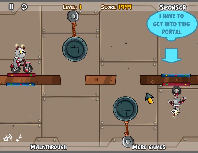 The robots find themselves in a very strange place: strange gravity, many evil robots and 25 levels to get through. They need to help! Use your mouse to cut ropes, delete obstacles and more. When you are ready, click on the robots to make them go.